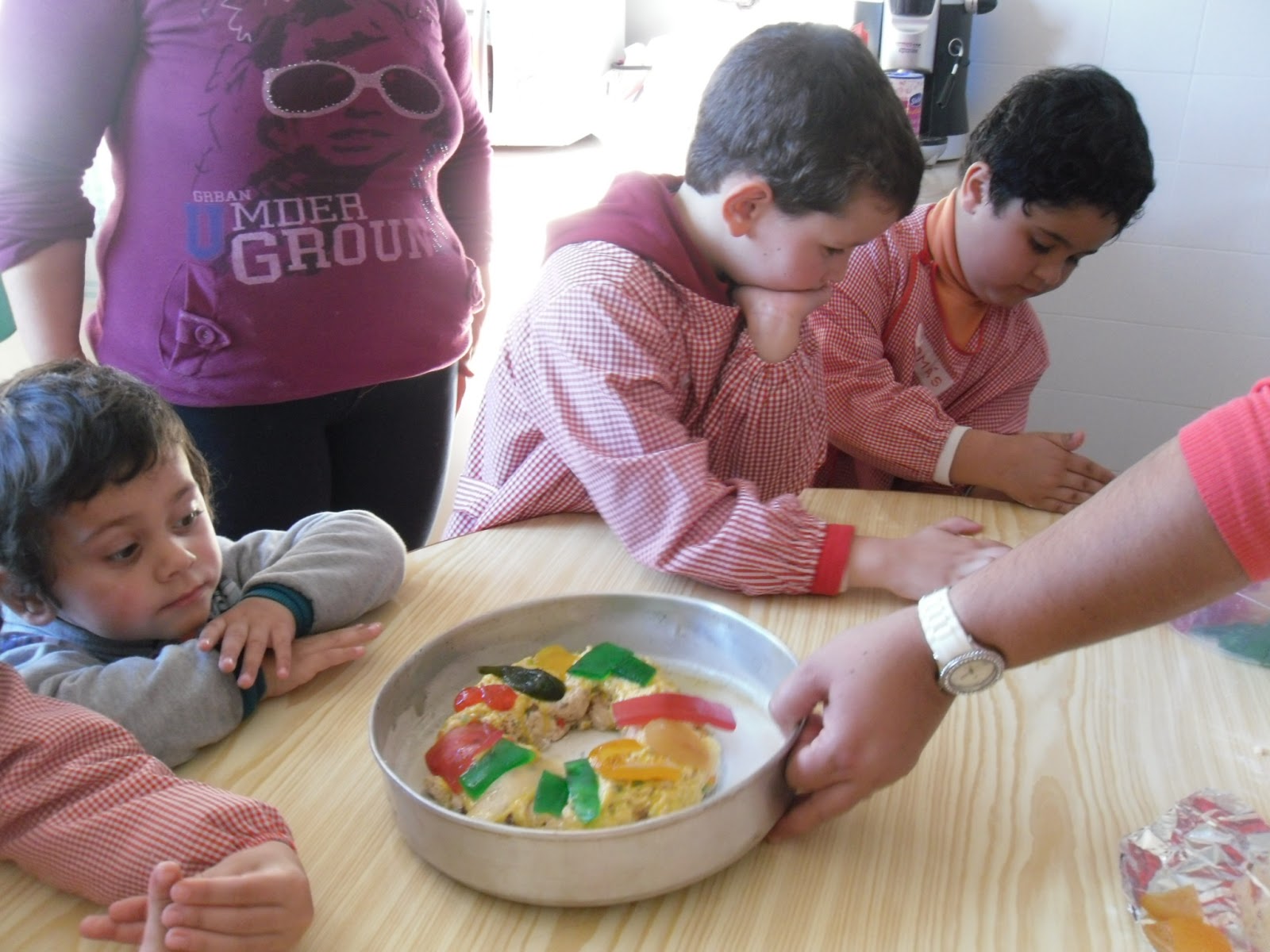 Na semana passada, as mães como estiveram a fazer bolos rei no feriado trouxeram massa e as frutas para decorar os bolos para os meninos assistirem à sua confecção.