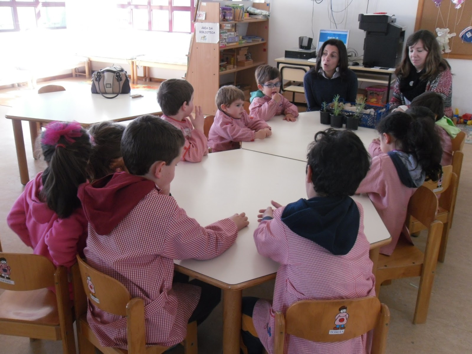 Esta semana comemora-se o dia mundial da árvore, da floresta e da poesia. Assim hoje vieram ao nosso Jardim a Anabela Protasio e a Helena Petisca do Município da Chamusca.Estiveram a conversar com os meninos e aprendemos muitas coisas interessantes. Deixaram-nos um gumelo parta depois fazer a experiência e e uns vasos com alecrim, arbusto que se encontra nas florestas.